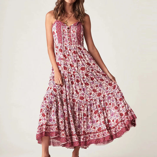 Strap Sleeveless Rayon Floral Maxi Boho Dress - redHign-concerned Chemical : None Craft of Weaving : Tat Fabric Type : Cotton blend Neckline : slash neck Waistline : empire Sleeve Style : regular Dresses Length : Mid-Calf Sleeve Length(cm) : Sleeveless Pattern Type : Print Silhouette : A-LINE Material : Cotton,Rayon Elasticity...