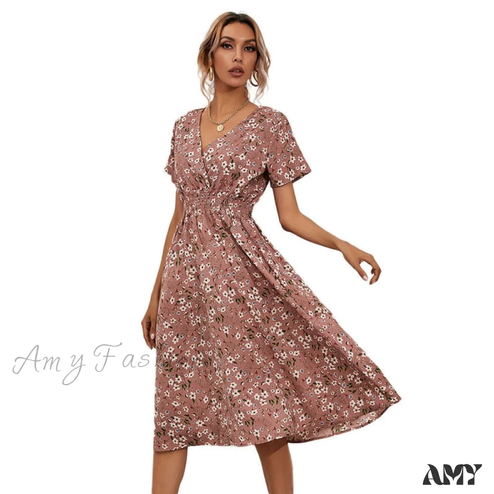Amy Fashion - V-neck Short Sleeve A-line Chiffon Beach Midi Dresses