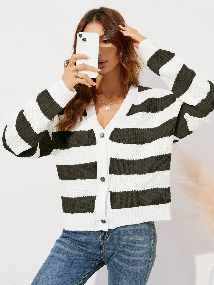 Amy Fashion - V-neck Single Breasted Long Sleeve Striped Sweater Cardigans