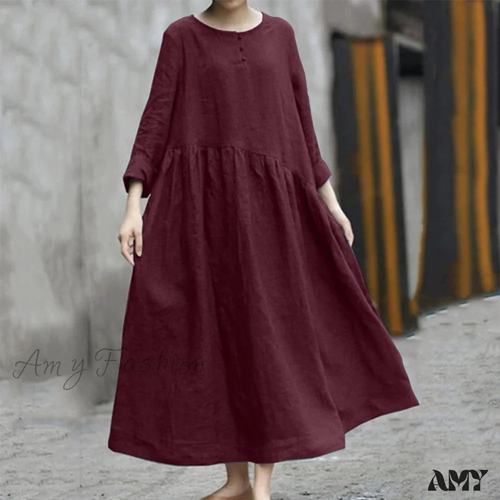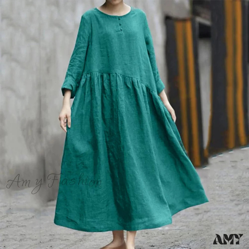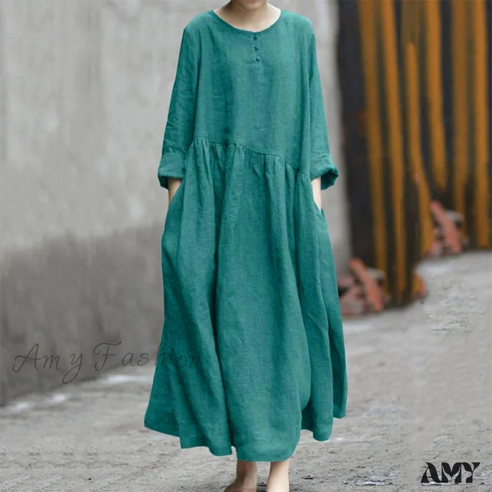 Amy Fashion - Casual Loose Buttons O Neck Pockets Baggy Dresses