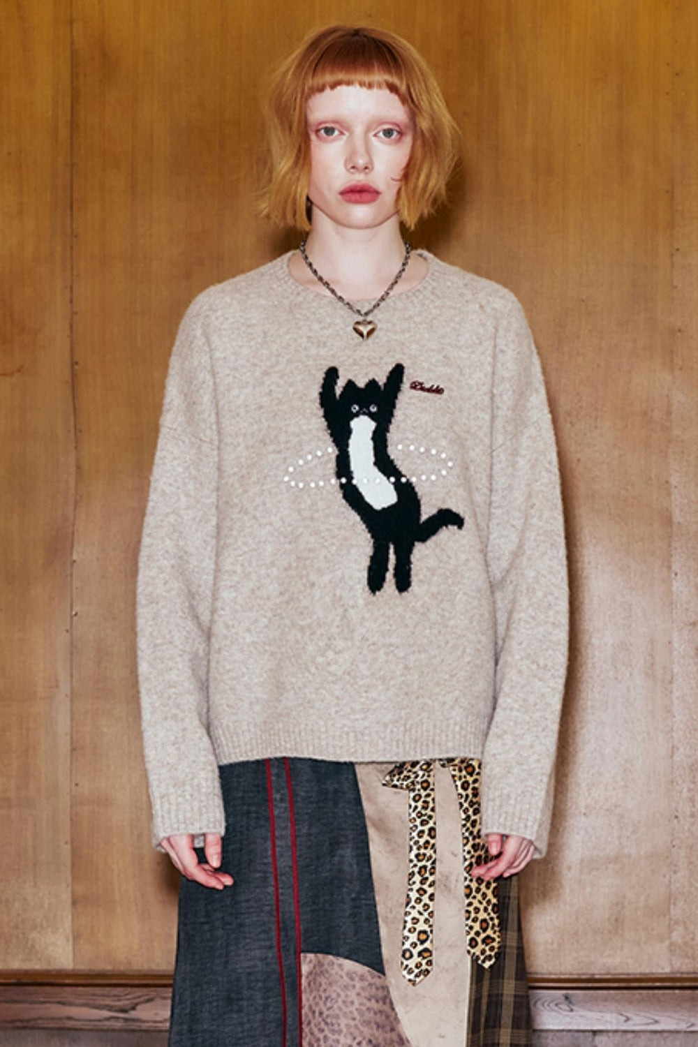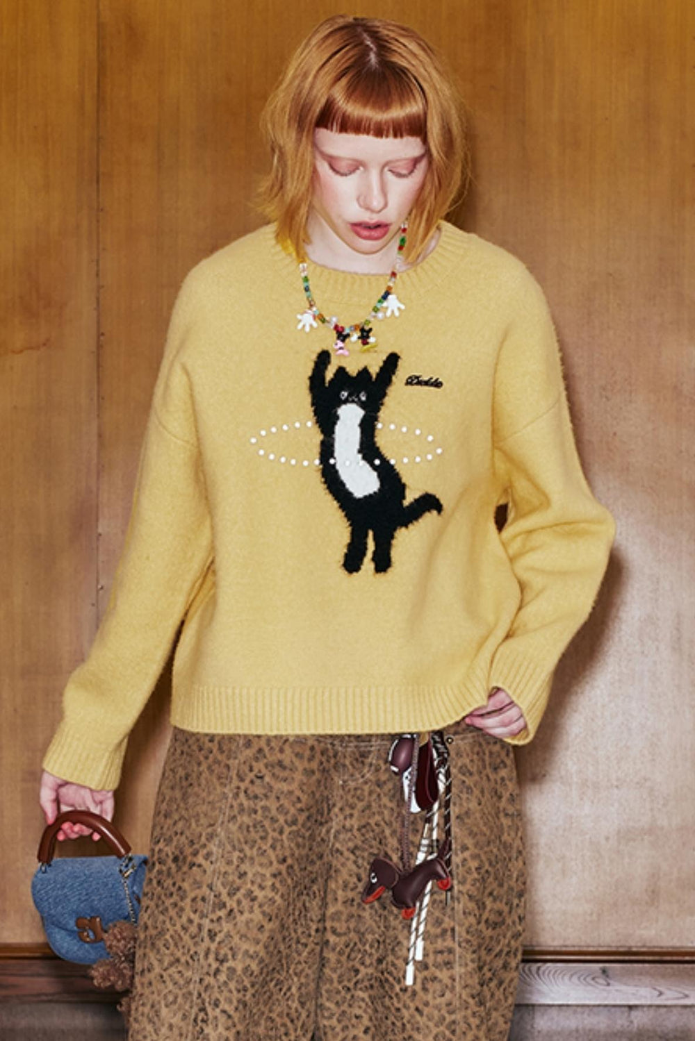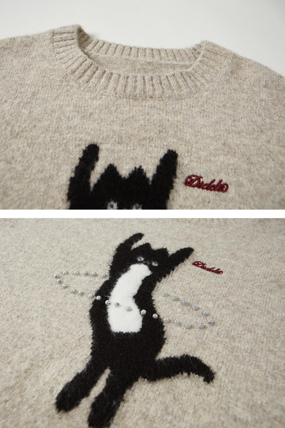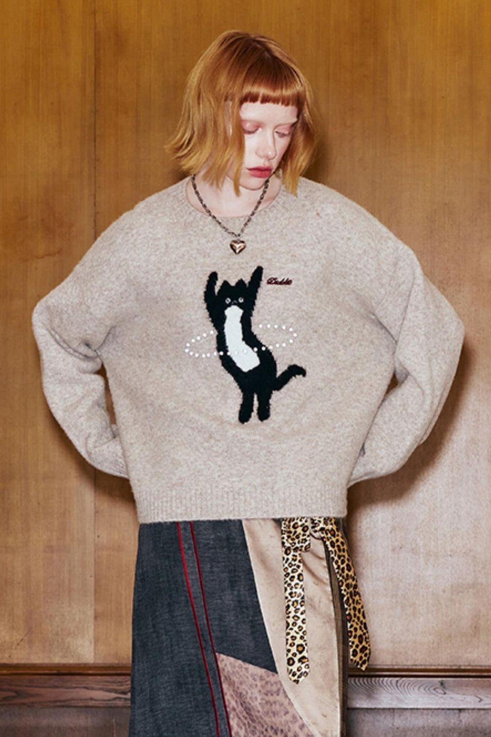 Introducing the Dancing Cat Knitted Sweater, a purr-fect addition to any wardrobe! Made from high-quality materials, this sweater features a playful dancing cat design that is sure to delight. With its cozy knit fabric and unique style, it's the purr-fect way to stay warm and stylish. Order yours today!
