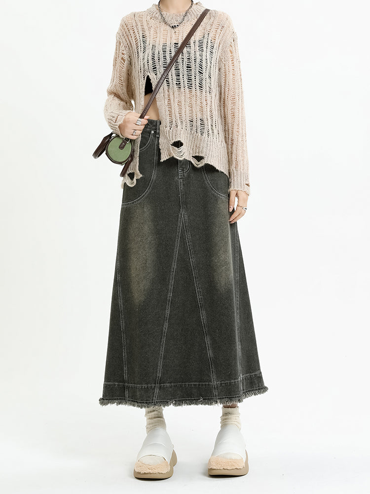 Transform your outfit with our Frayed Hem Denim Midi Skirt! Its stylish frayed hem adds a touch of edge to your look, while the midi length provides versatile styling options. Made from durable denim, this skirt is the perfect addition to your wardrobe for effortless and chic styling.