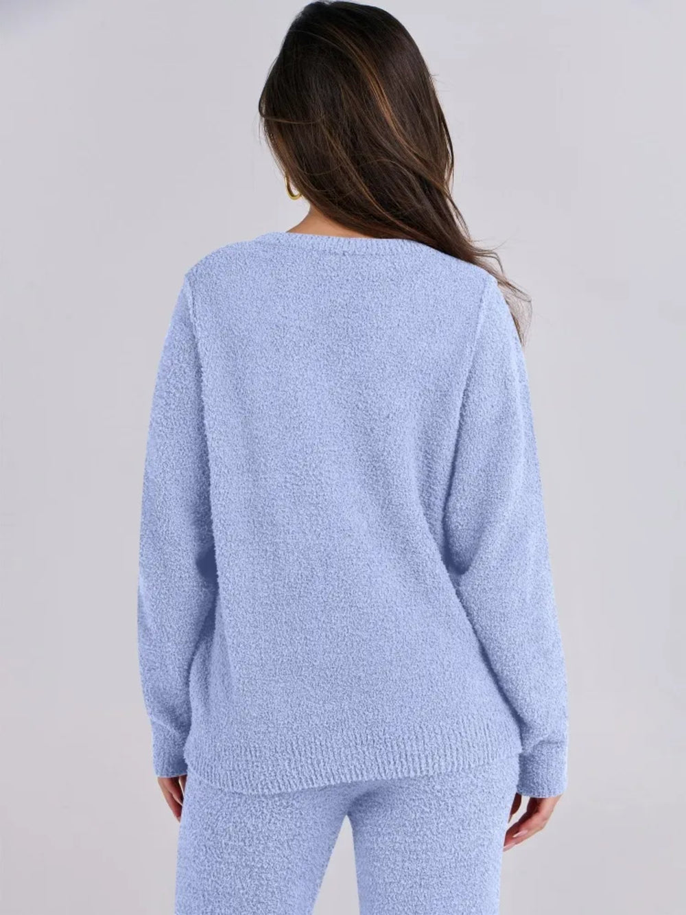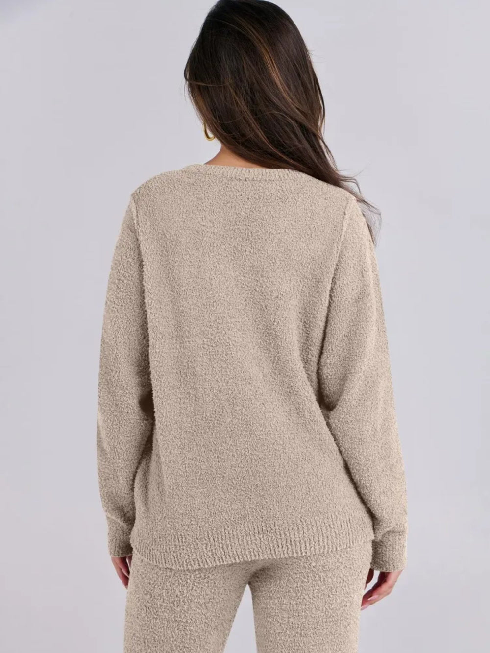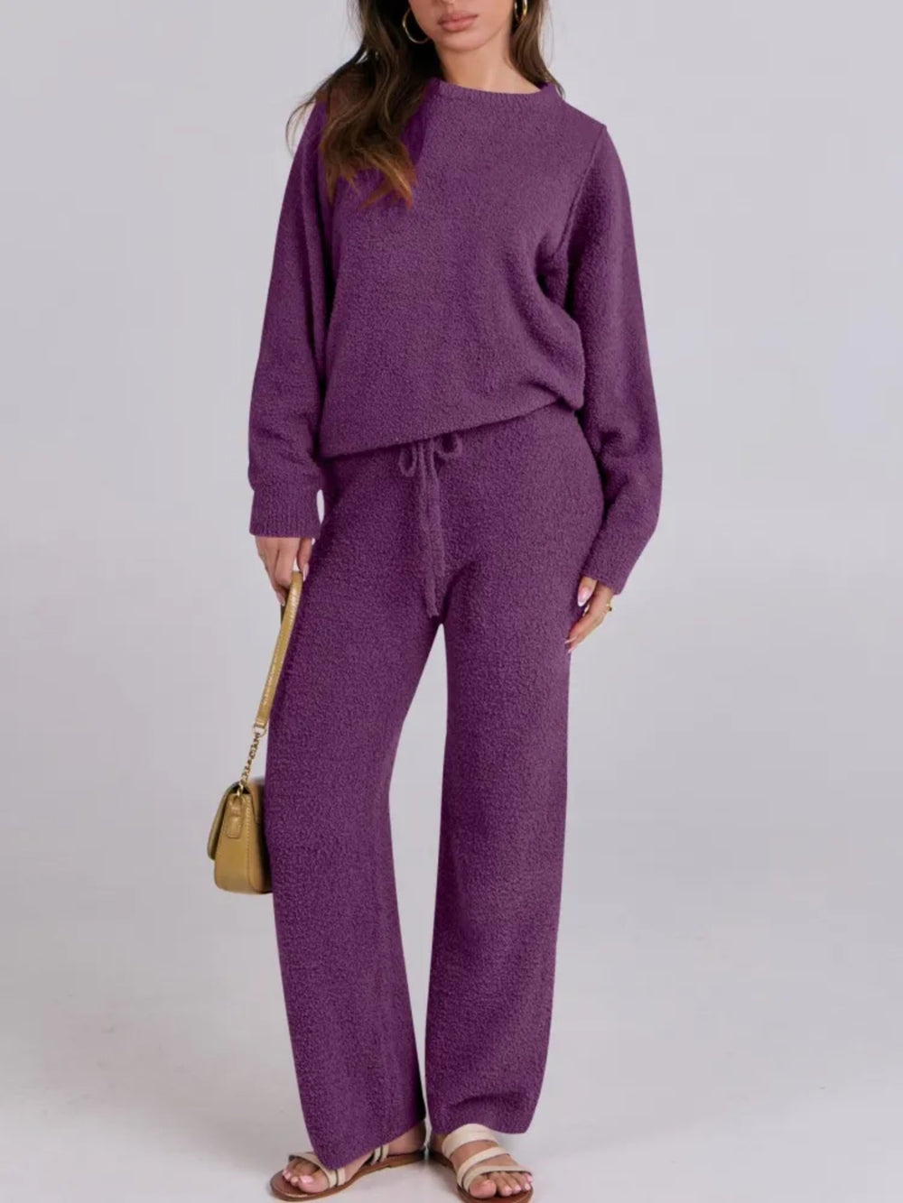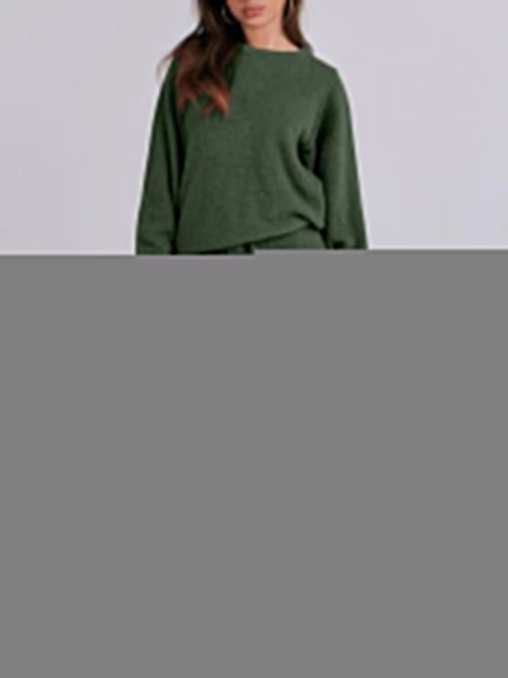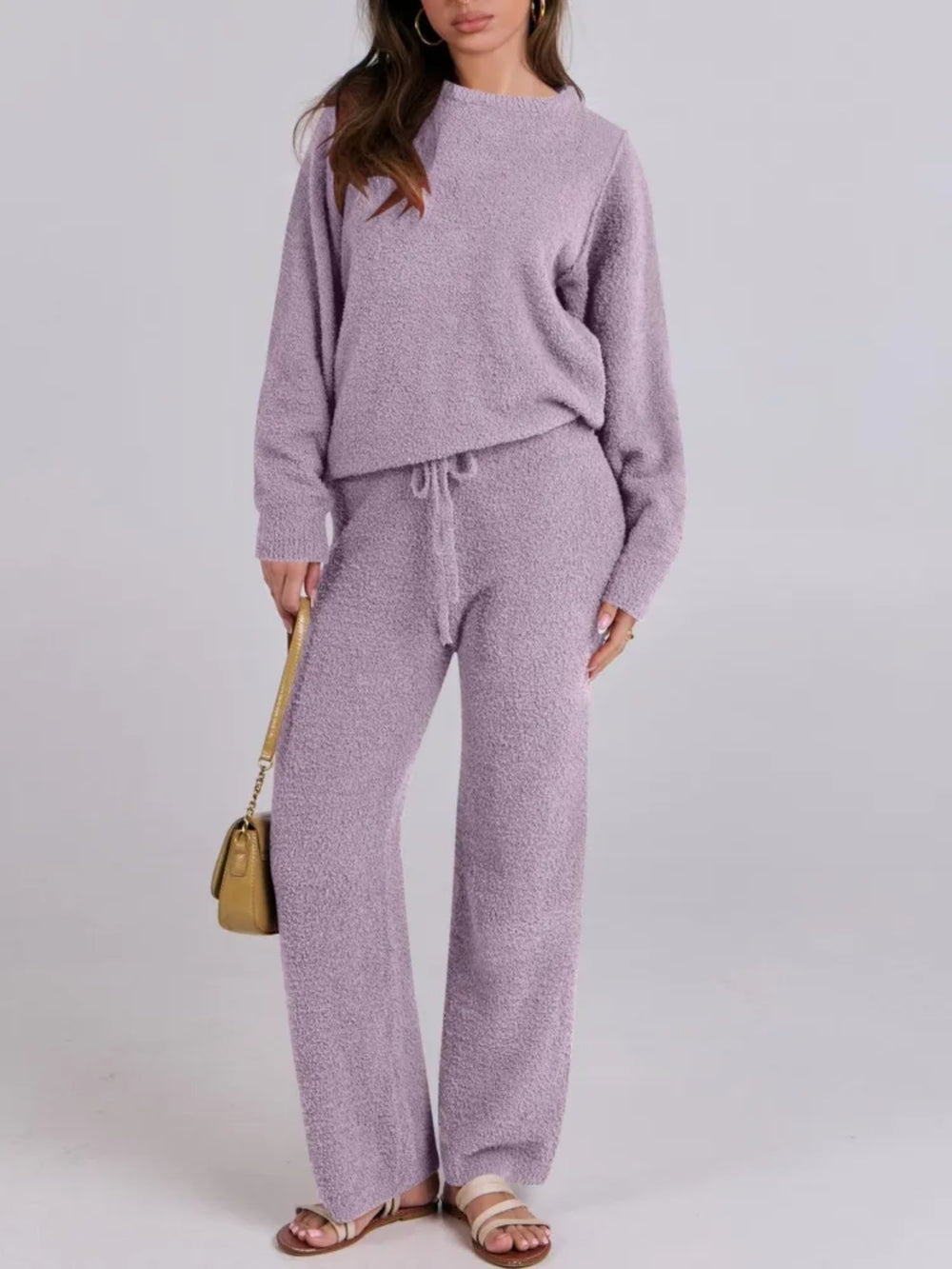 Sit in comfort with this ultra-cozy lounge set. crafted from soft. textured knit fabric for a luxurious feel. Featuring a comfy-fit sweater and matching wide-leg pants. this versatile set is ideal for lounging at home or casual outings. With its minimalistic design and pastel tones. it blends comfort and style seamlessly. making it an essential addition to your wardrobe.