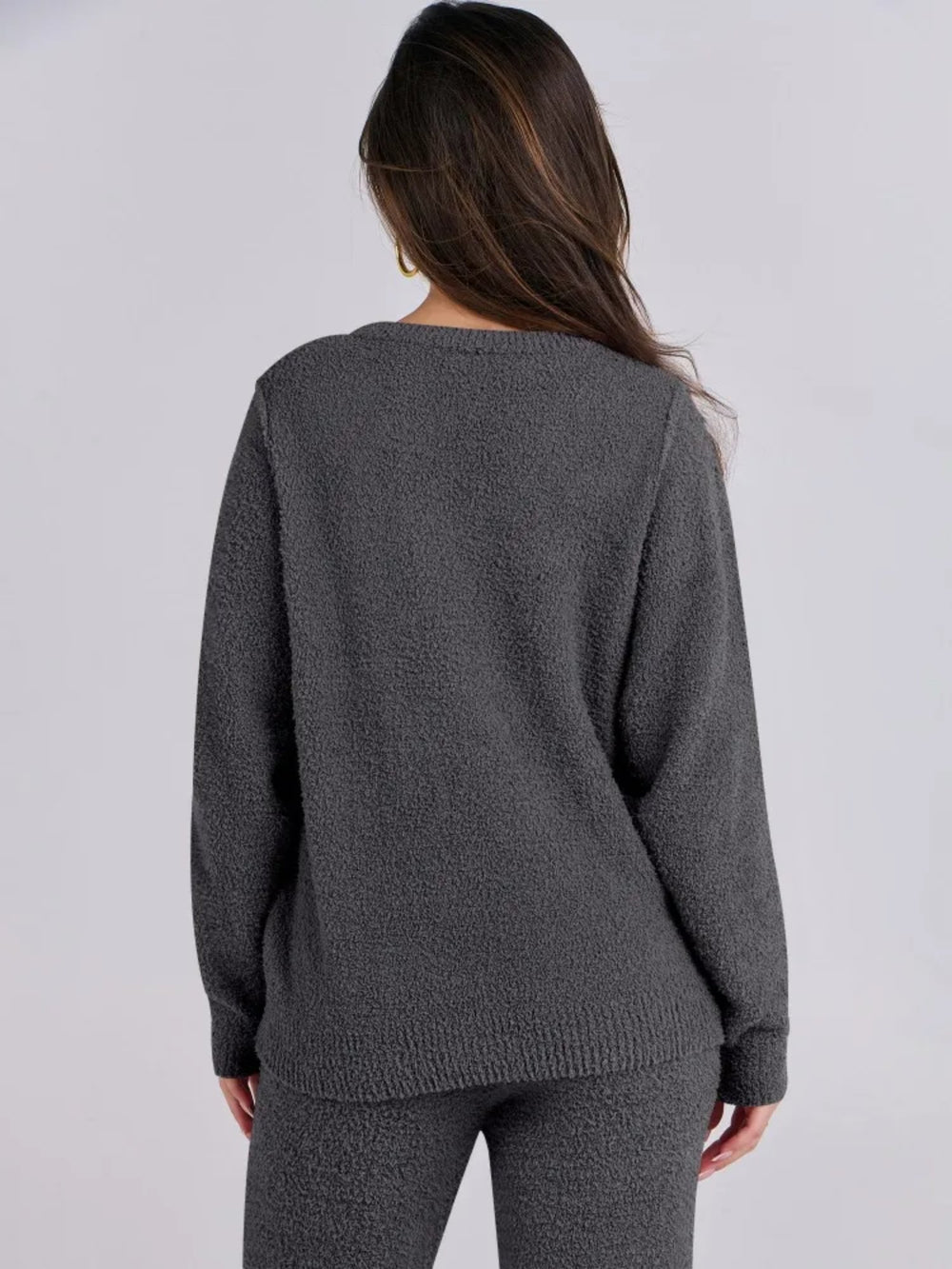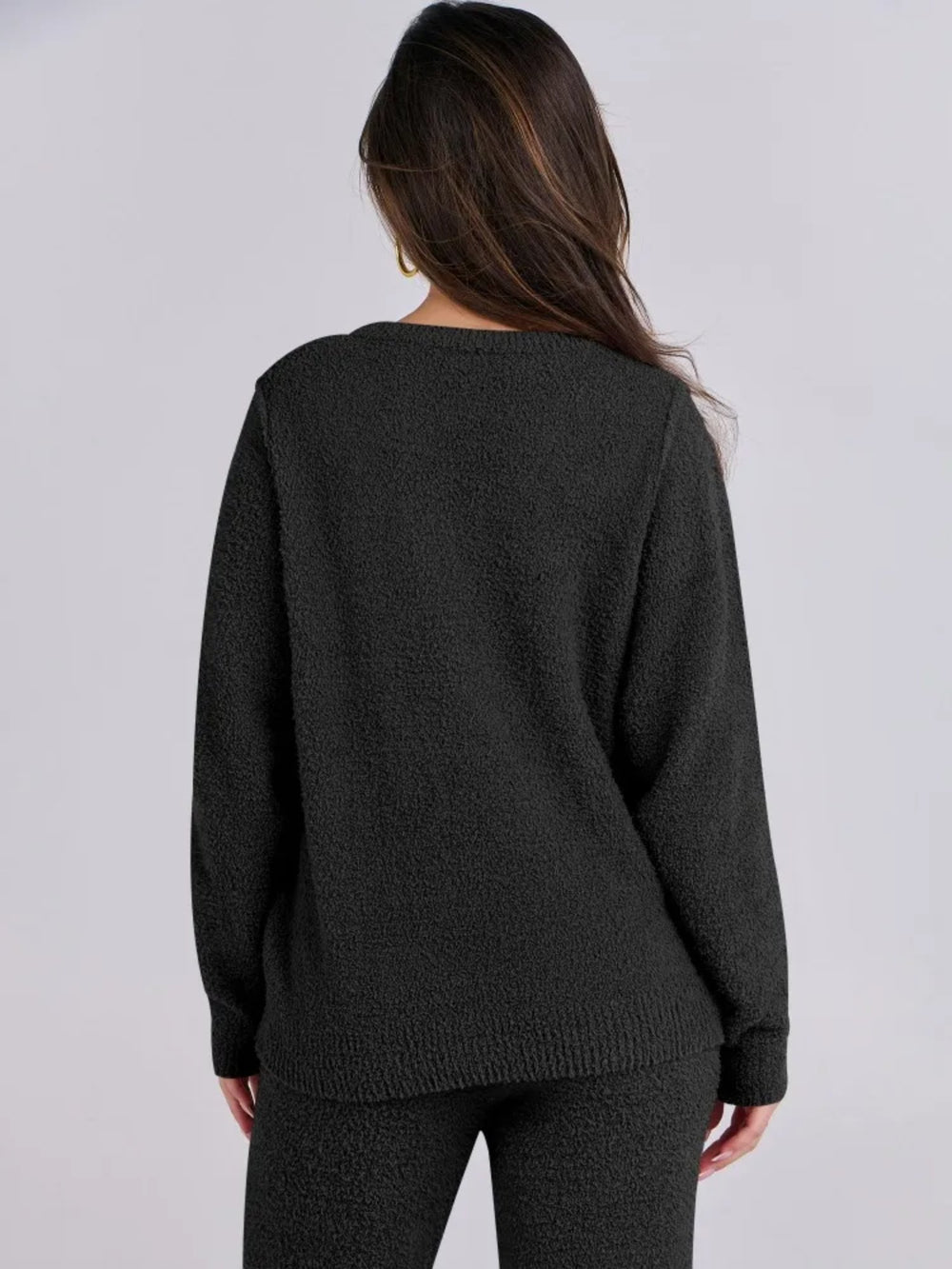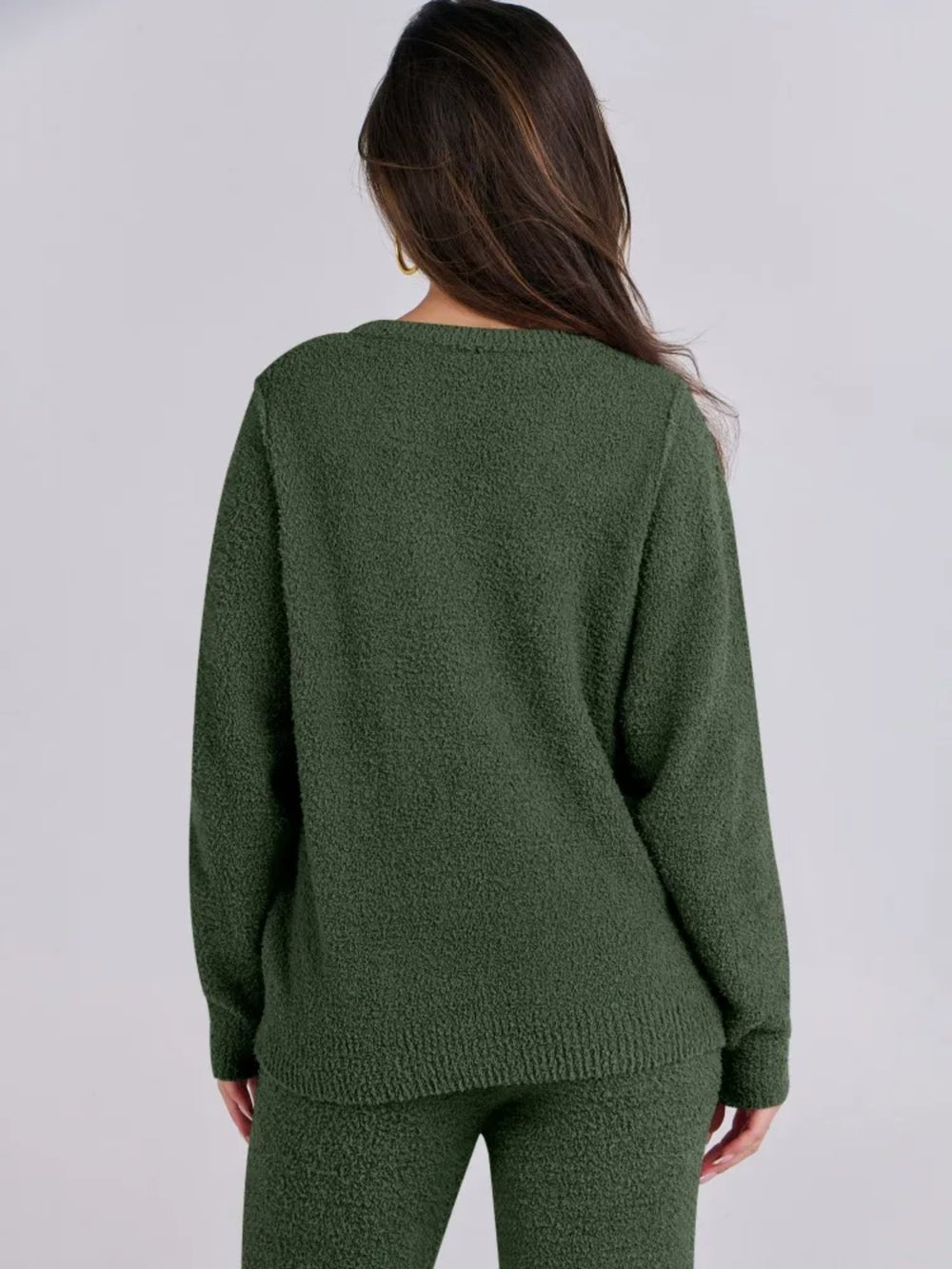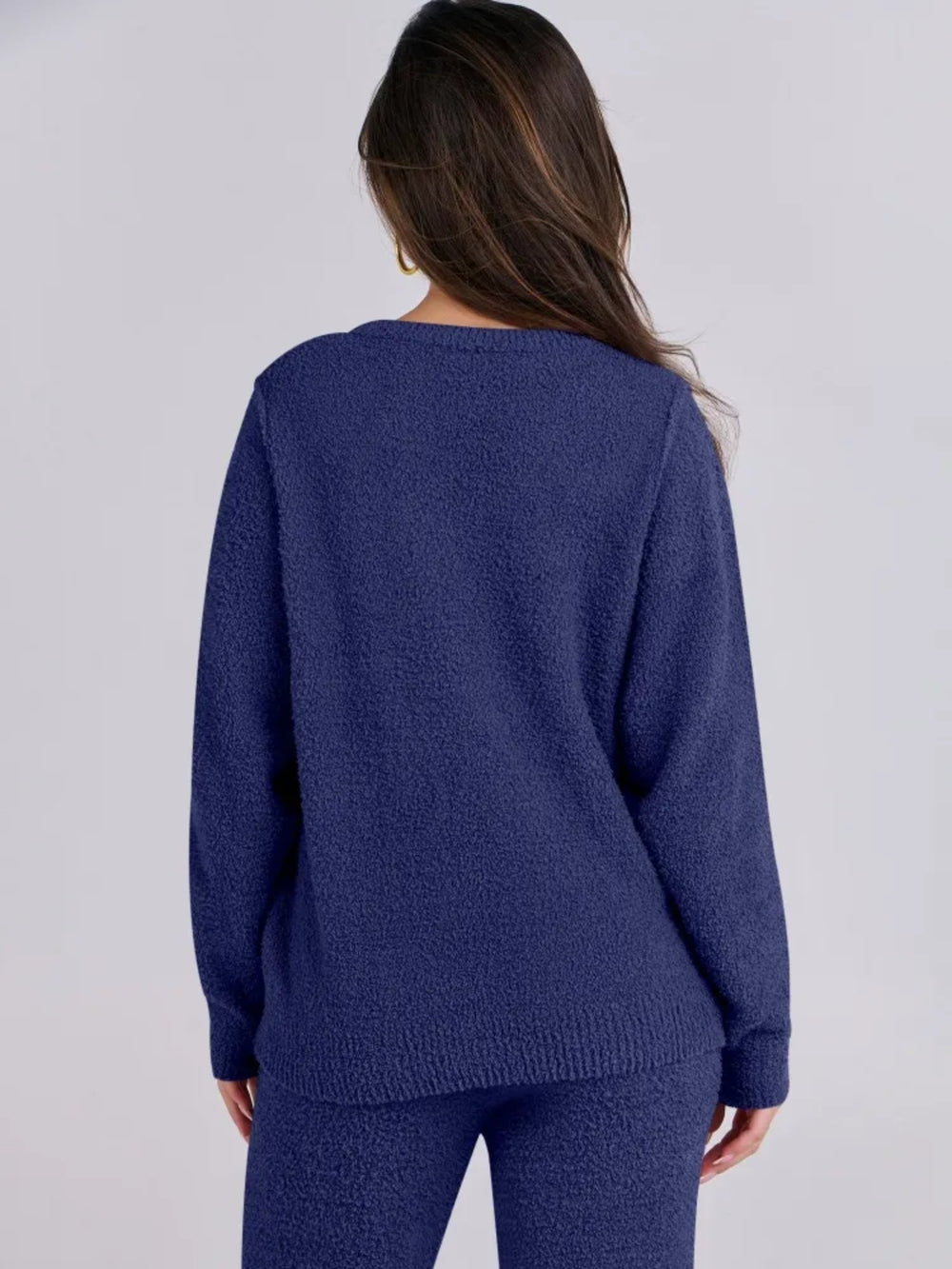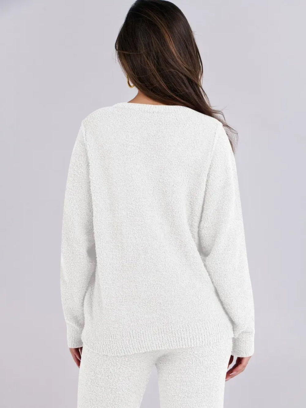 Sit in comfort with this ultra-cozy lounge set. crafted from soft. textured knit fabric for a luxurious feel. Featuring a comfy-fit sweater and matching wide-leg pants. this versatile set is ideal for lounging at home or casual outings. With its minimalistic design and pastel tones. it blends comfort and style seamlessly. making it an essential addition to your wardrobe.