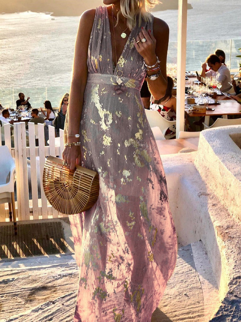 V-Neck Print Hot Stamping Maxi Dress