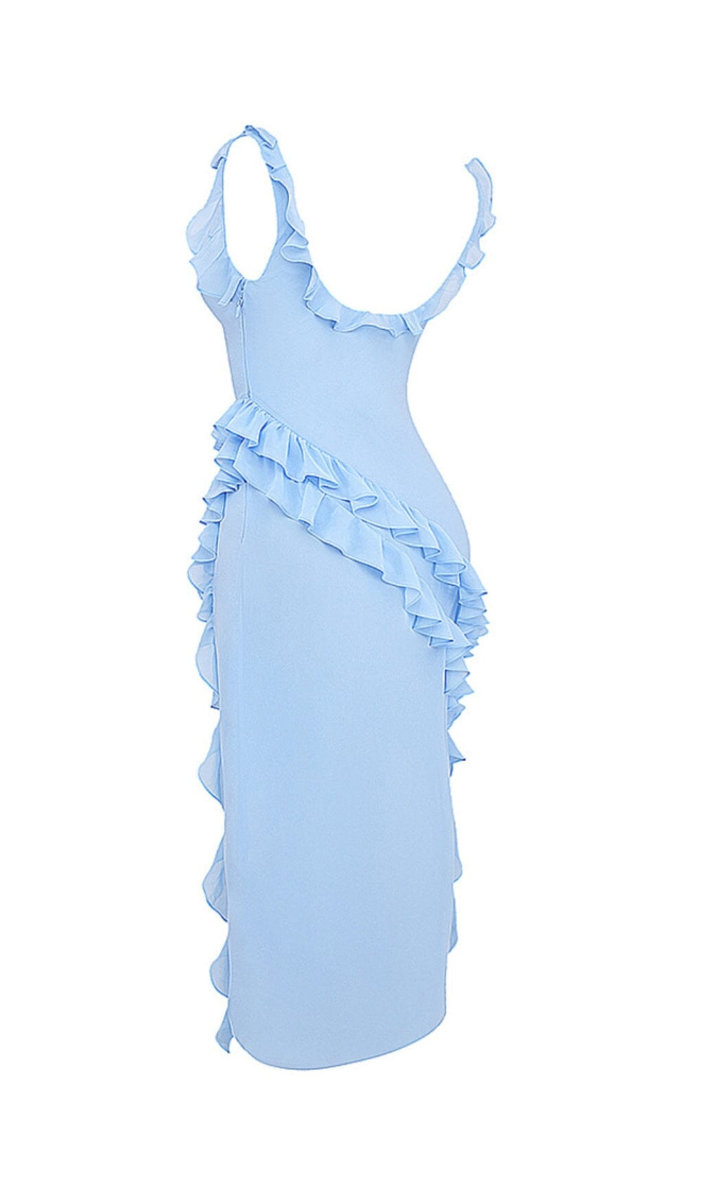 Our SOFT BLUE RUFFLE MAXI DRESS is beautifully embellished with fluttery ruffles that add pretty dimension to this ultra sexy silhouette. Cut from lightweight georgette. the dress is elegant and striking in a soft blue hue.
