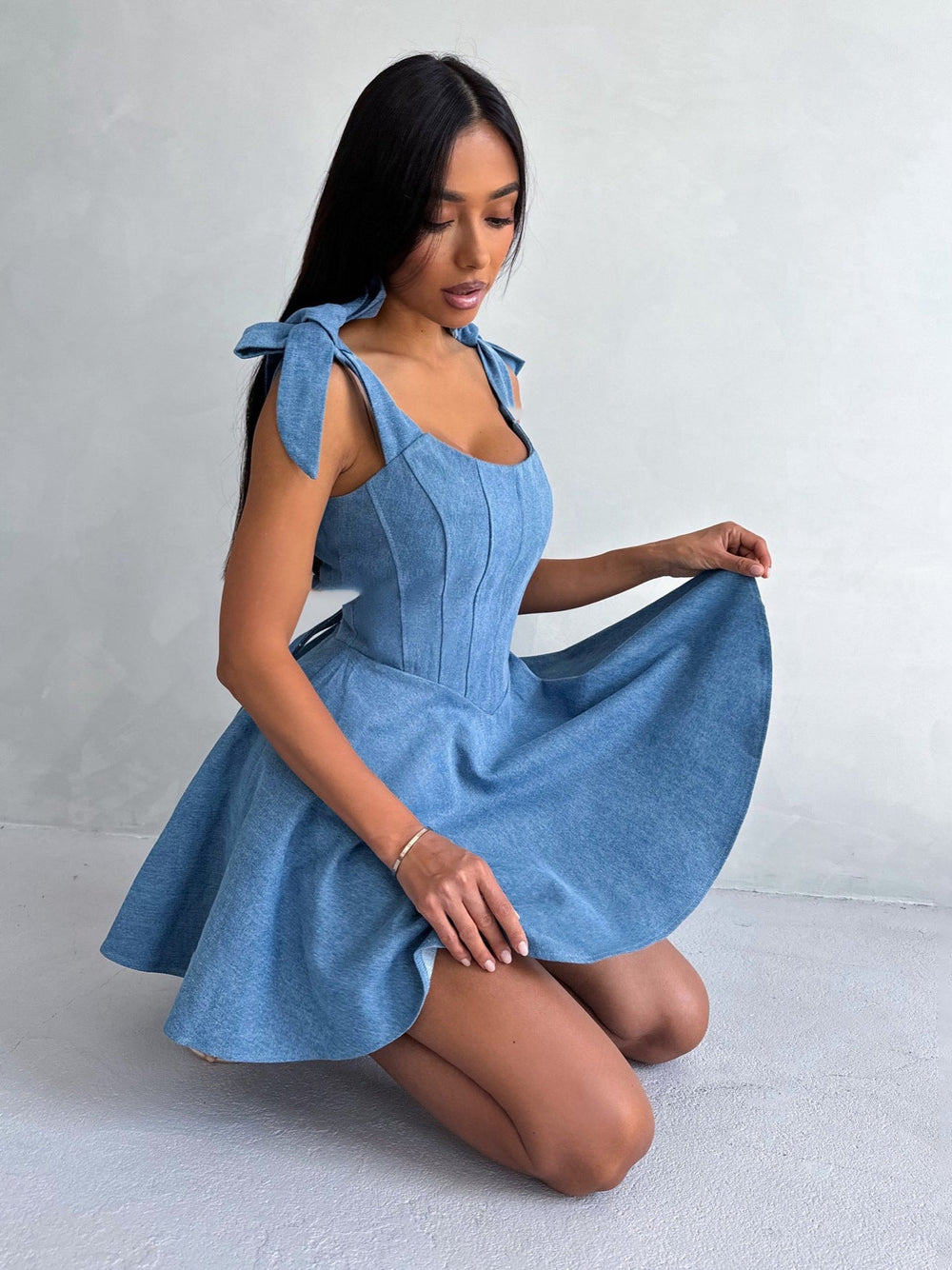 Playful, chic, and ultra-flattering — the Bella Bow-Tie Denim Mini Dress is your new summer favorite. Crafted from lightweight denim with a structured bodice and flared skirt, it hugs your curves in all the right places. The statement bow-tie shoulder straps add a flirty touch, while the square neckline brings effortless elegance. Perfect for daytime dates, casual outings, or dressing up with heels for a night out.