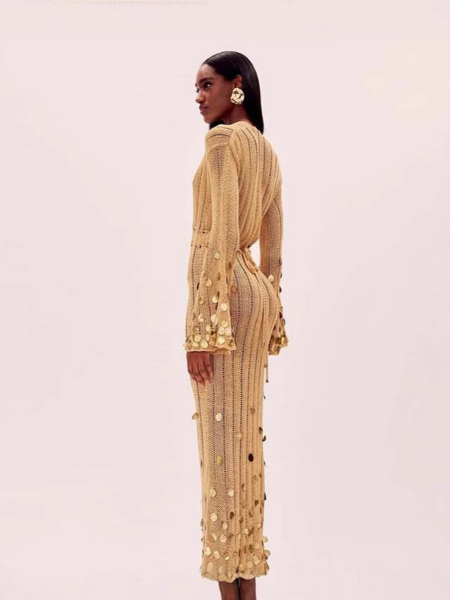 Radiate pure luxury in the Celeste Gold Sequin Gown. This show-stopping piece features a plunging neckline, flared sleeves, and an elegant silhouette adorned with shimmering gold sequins that catch the light from every angle. Perfect for galas, red carpet moments, or unforgettable celebrations, this dress is made for women who command attention and leave a lasting impression. Bold. Glamorous. Unapologetically divine.
