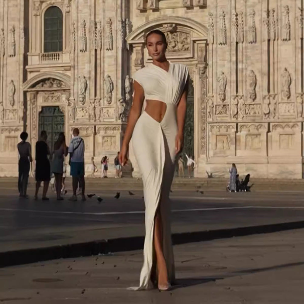 A sculpted evening gown infused with divine elegance. The draped detailing across the bodice and skirt flows seamlessly into a bold side cut-out that highlights the waist with sophisticated sensuality. Crafted in ivory white, this dress is made for moments that demand presence. Power, femininity, and artistry — all in one stunning piece.