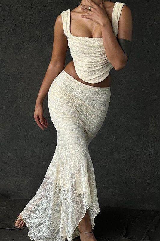 This elegant two-piece lace fishtail skirt dress is perfect for formal occasions. The intricate lace detailing and flattering fishtail silhouette will make you feel like a timeless beauty. The versatile design allows you to mix and match for different occasions, making it a versatile addition to your wardrobe.