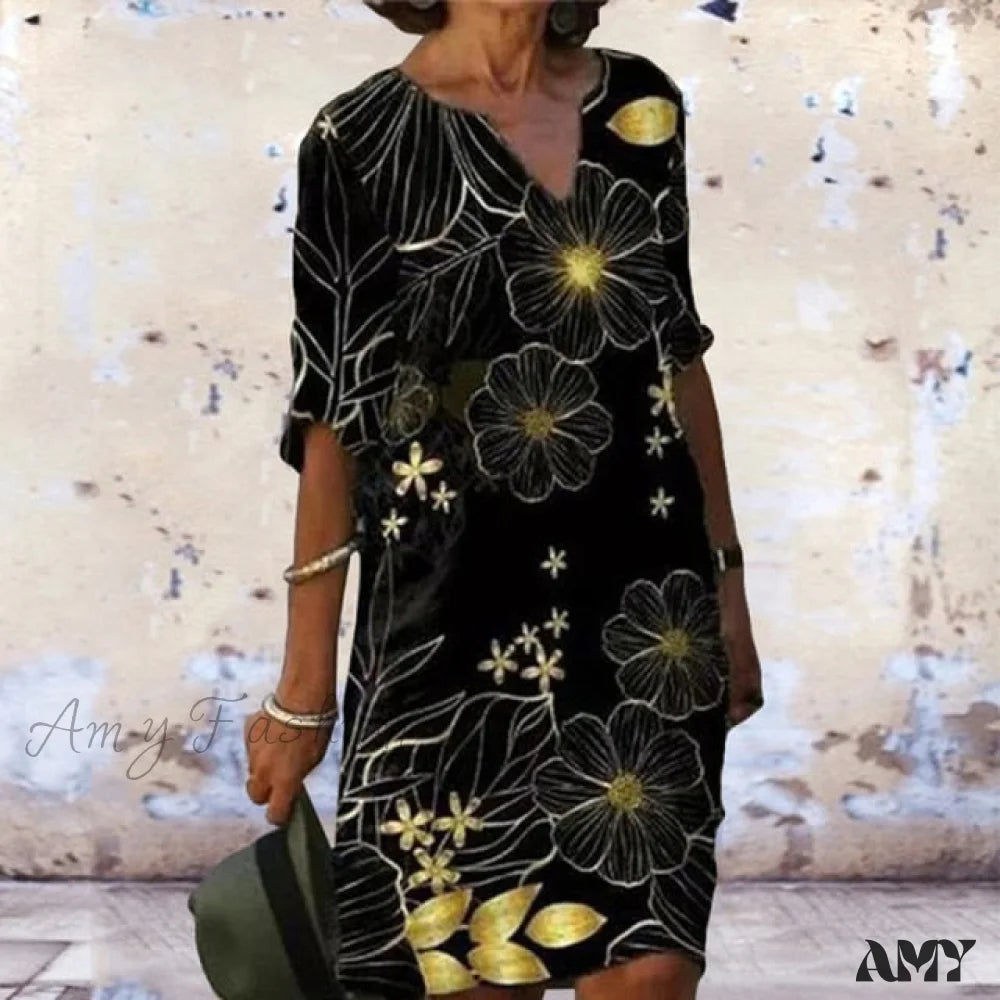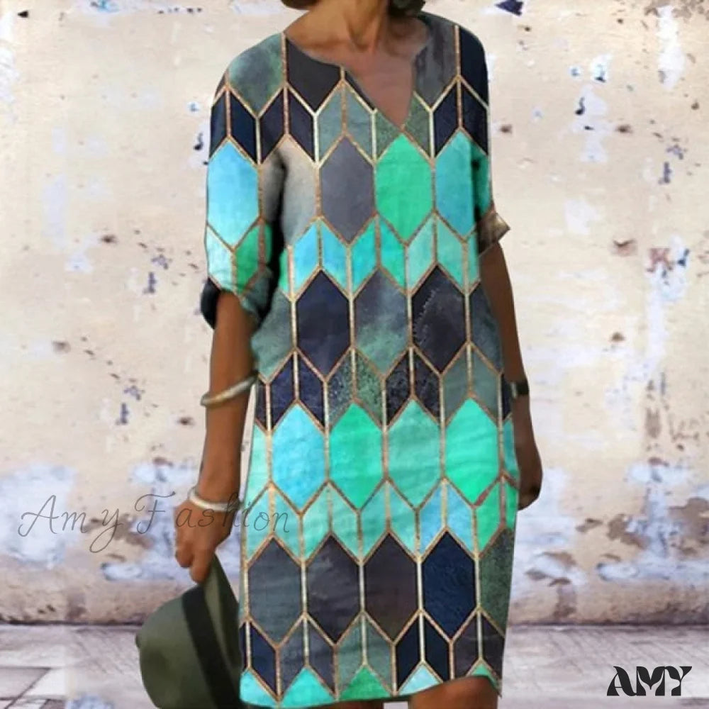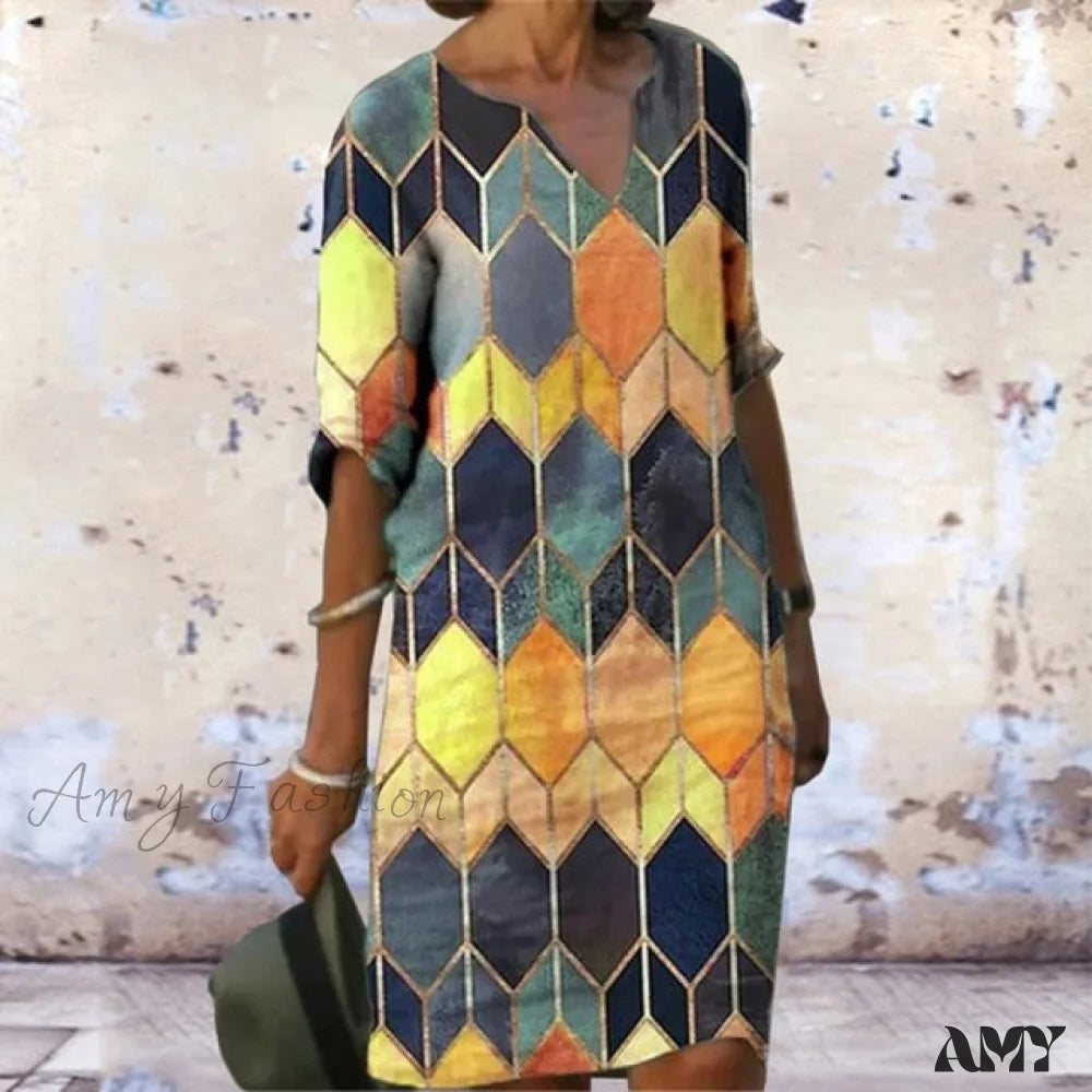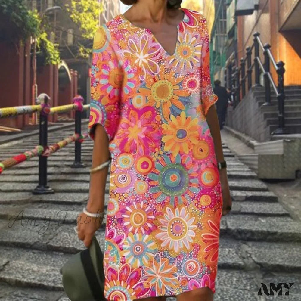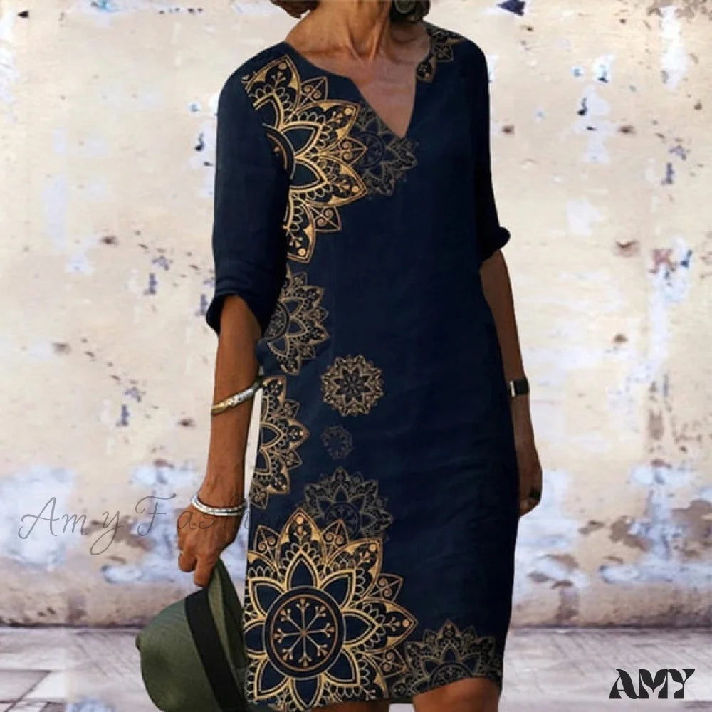Amy Fashion - Vintage Printed V-neck Knee Length Straight Dresses