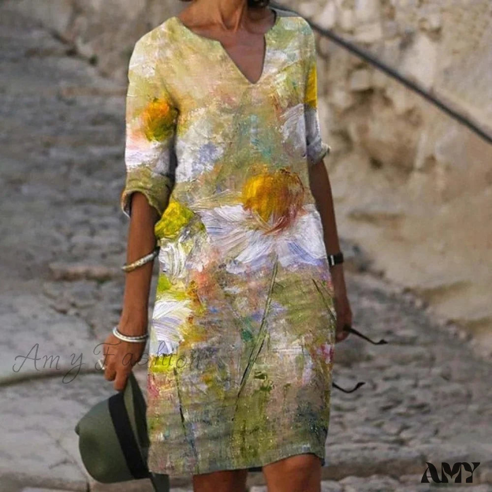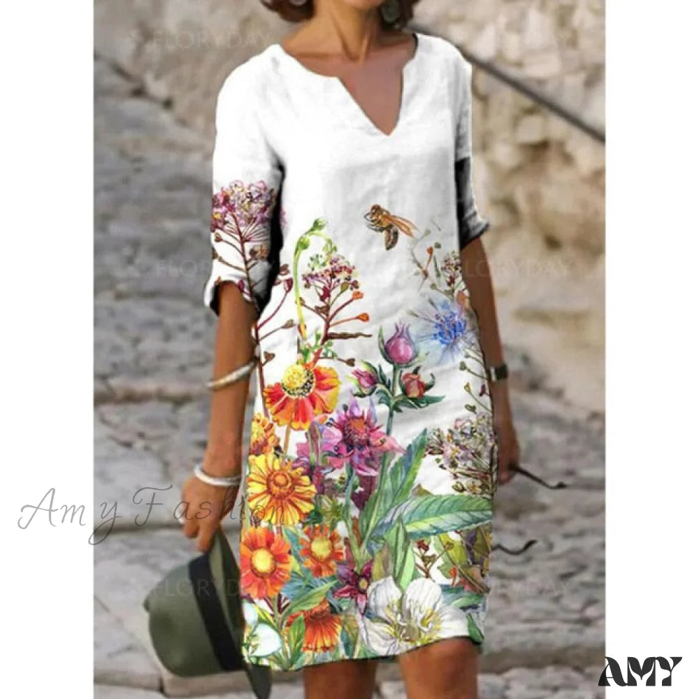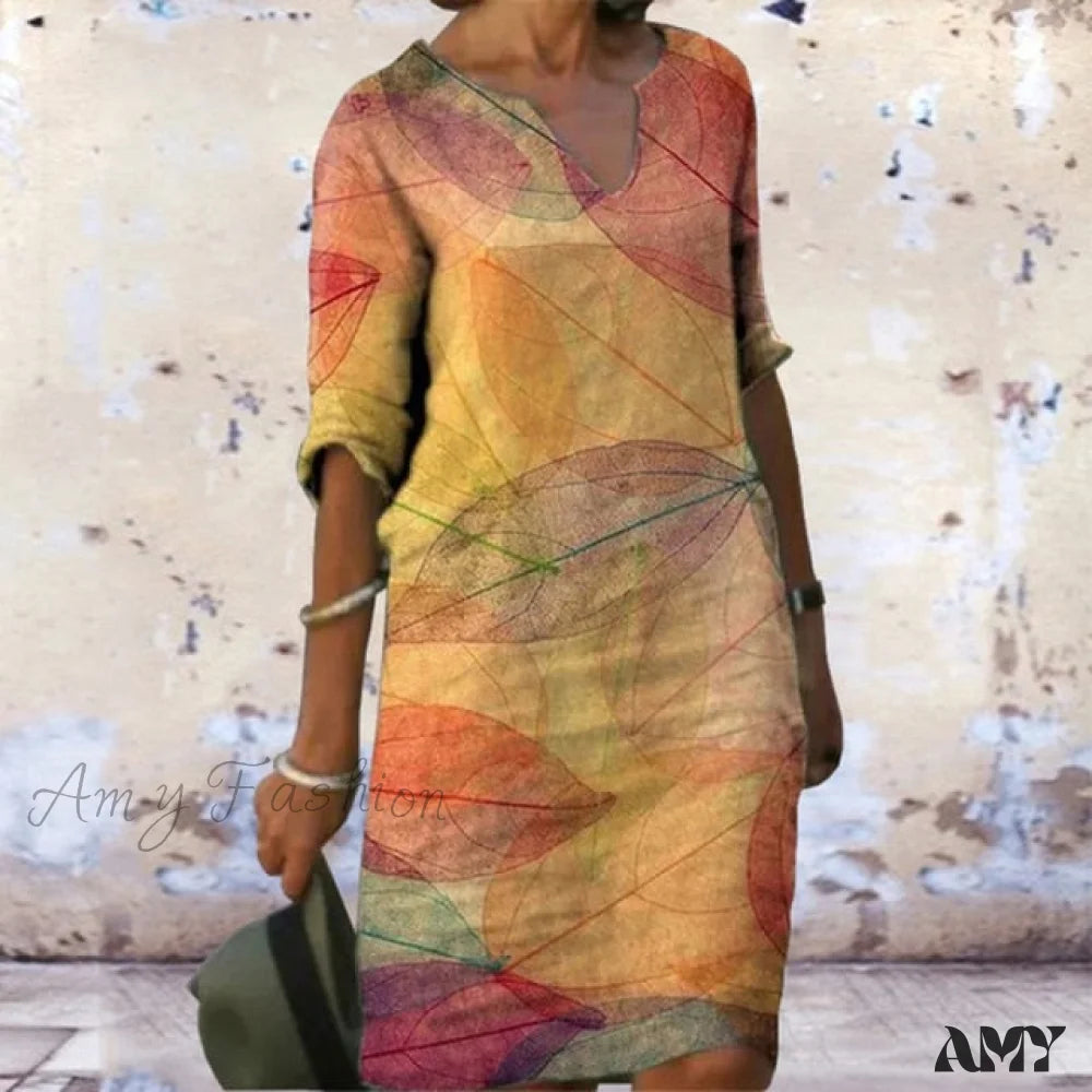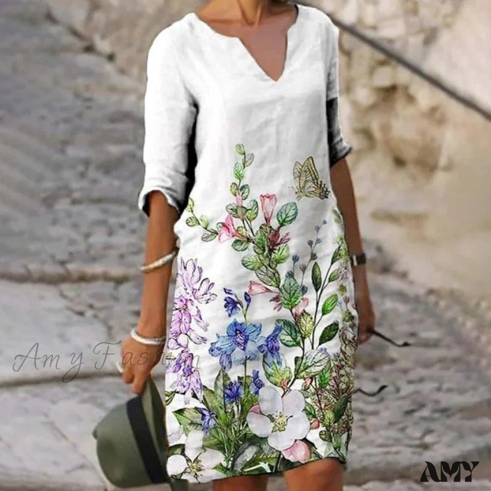 Amy Fashion - Vintage Printed V-neck Knee Length Straight Dresses