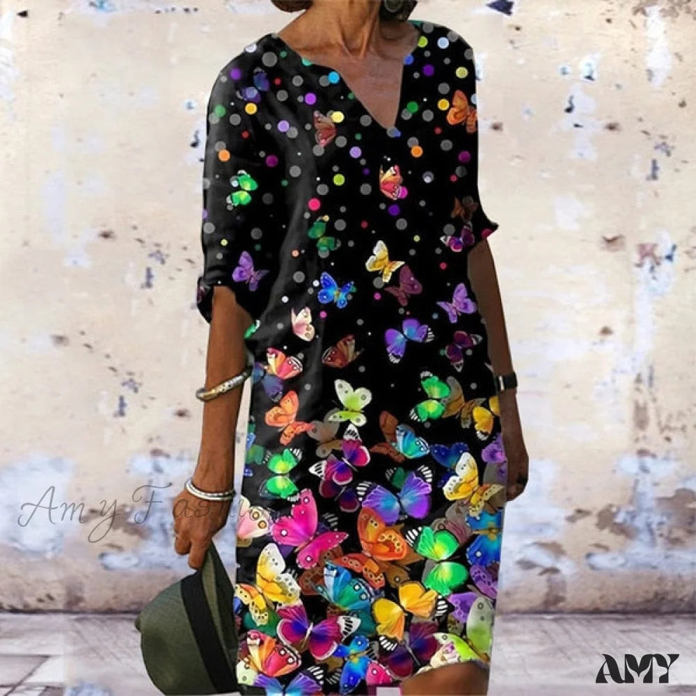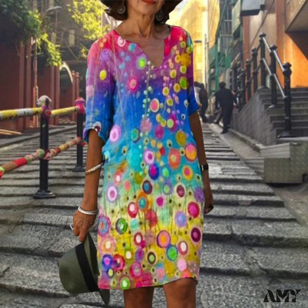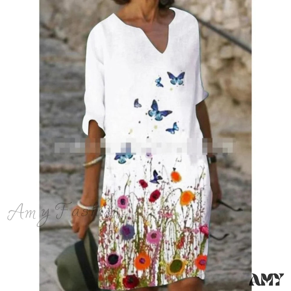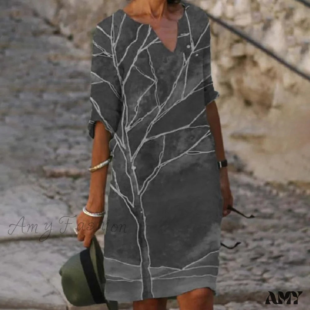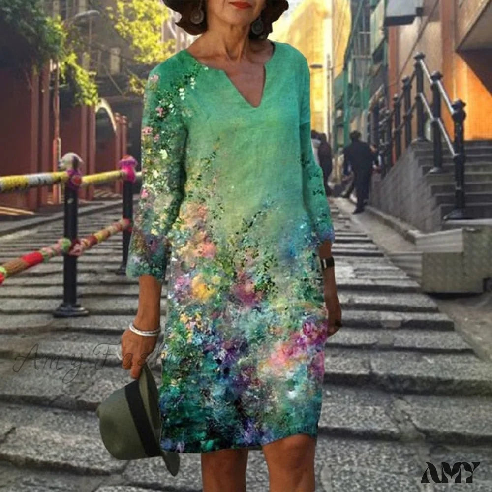 Amy Fashion - Vintage Printed V-neck Knee Length Straight Dresses